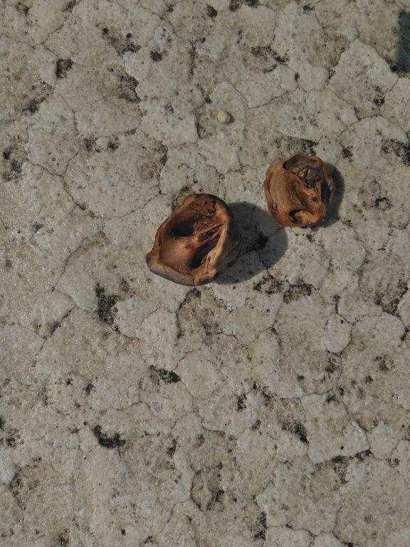 カラスが中身を食べた、クルミの空です。これは、くわえて上から落として、割ったものです。最近は、車の通るところに置いて割ってもらう、カラスも見かけます。