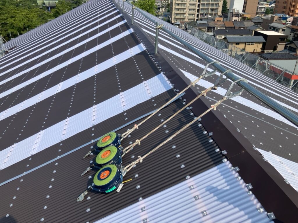 屋根棟上に墜落制止用器具取付用の手摺を設置しました。
