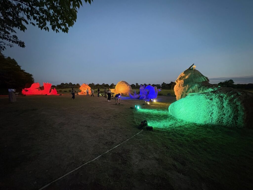 様々な生物に越後の要素を取り入れた5体のわらアート作品がライトアップされていて、幻想的な展示でした。