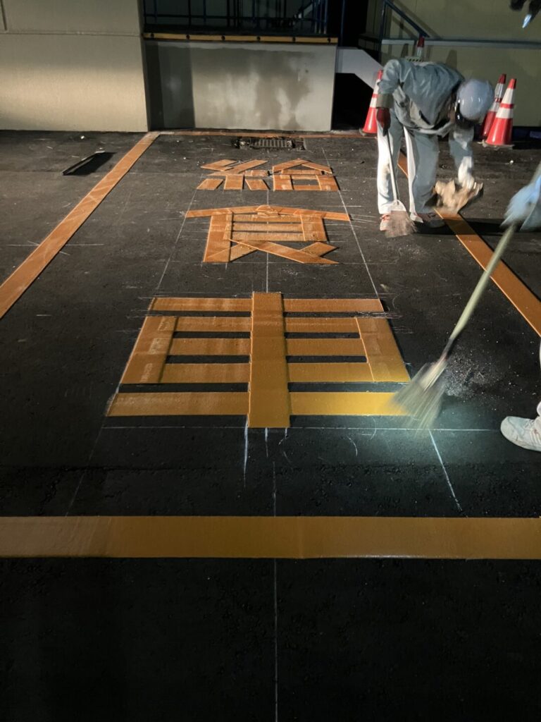 もう少しで部分引渡し間近ですが、天候が良かったのもあって遅く迄ライン引きを行いました。