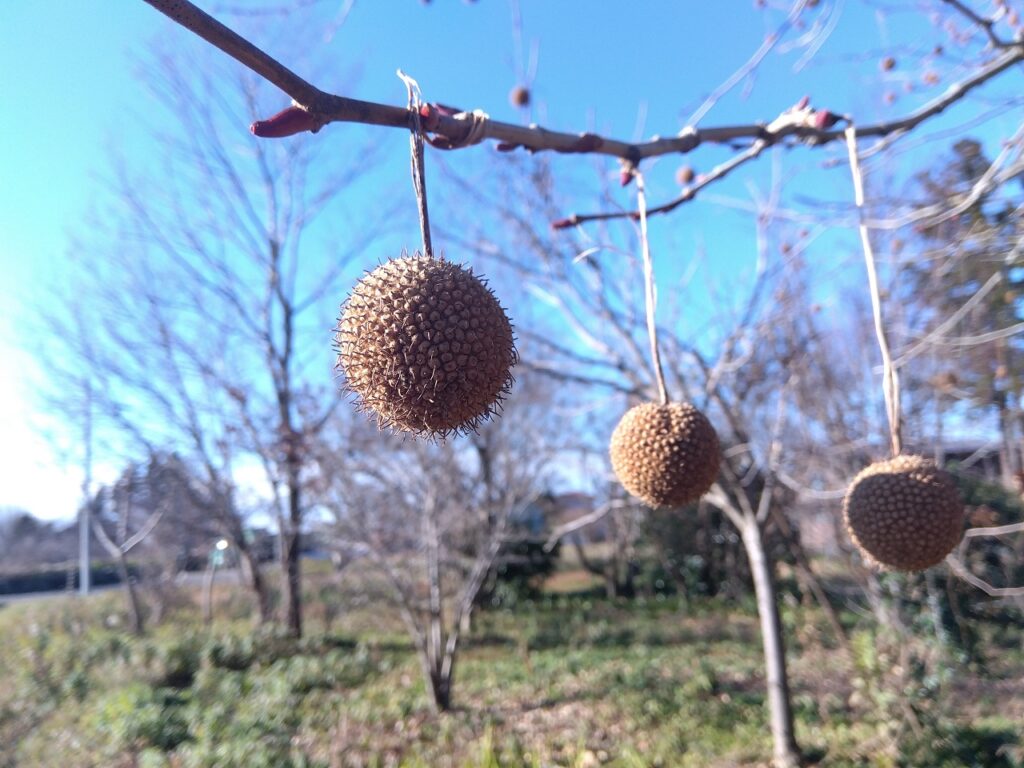 木の所々から鈴の様な実がぶら下がっているのが特徴の木で、Googleレンズによると「スズカケノキ」だそうです。