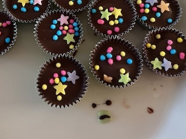 アルミカップにチョコを入れて固めてデコレーションをしたチョコ。