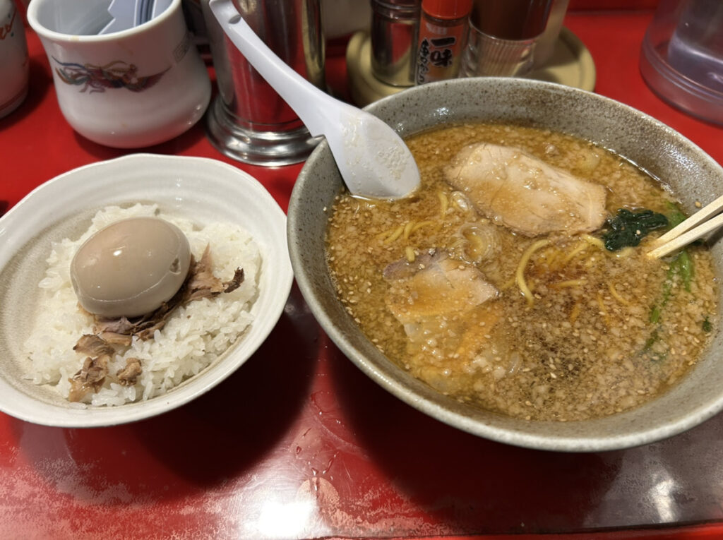 ピリ辛背油煮込みラーメンとどろ玉ごはんで血糖値爆上げしました。