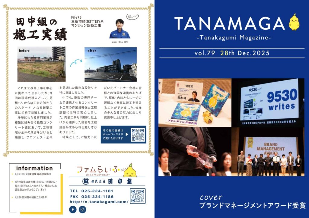 1か月の間に起きた田中組のニュースや、最近の施工実績を掲載。ブログだけではわからない田中組の今をお伝えします。